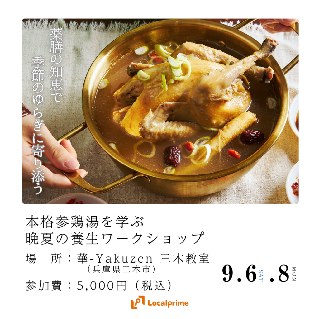 ホーム » 体験・イベント » 〔2025/9/6(土),8(月)開催〕薬膳の知恵で季節のゆらぎに寄り添う ~本格参鶏湯を学ぶ晩夏の養生ワークショップ~
