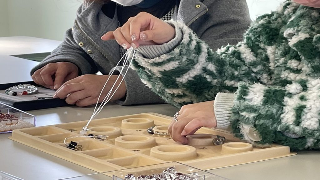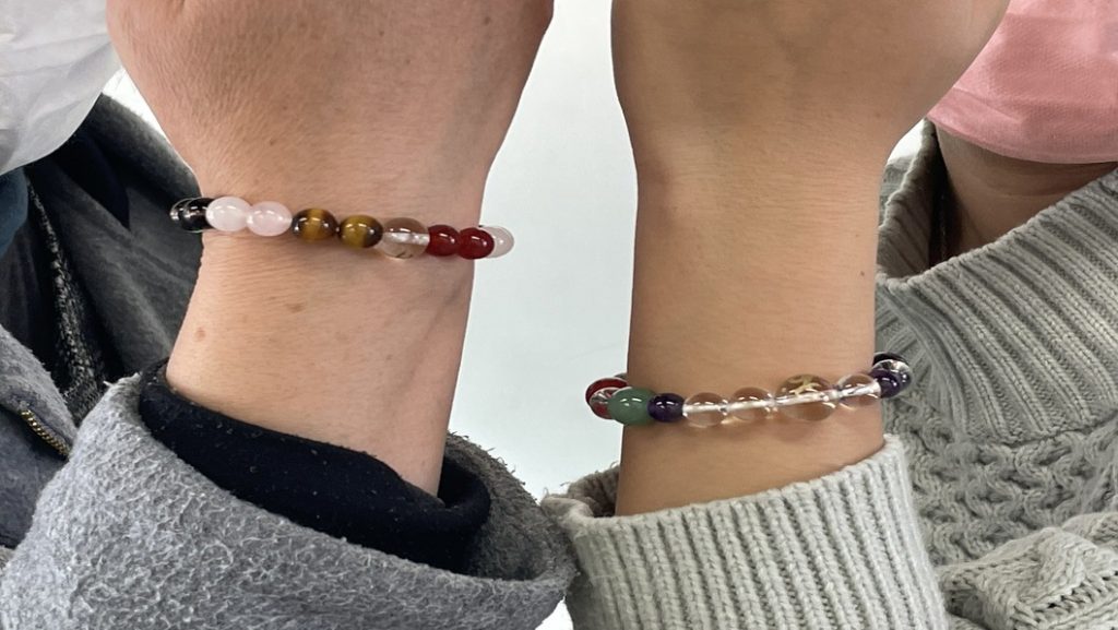 • 参拝後は、斑鳩寺ご住職によりお清めされた厄除け開運の七色の数珠玉を使った、オリジナルブレスレット作りを体験する。