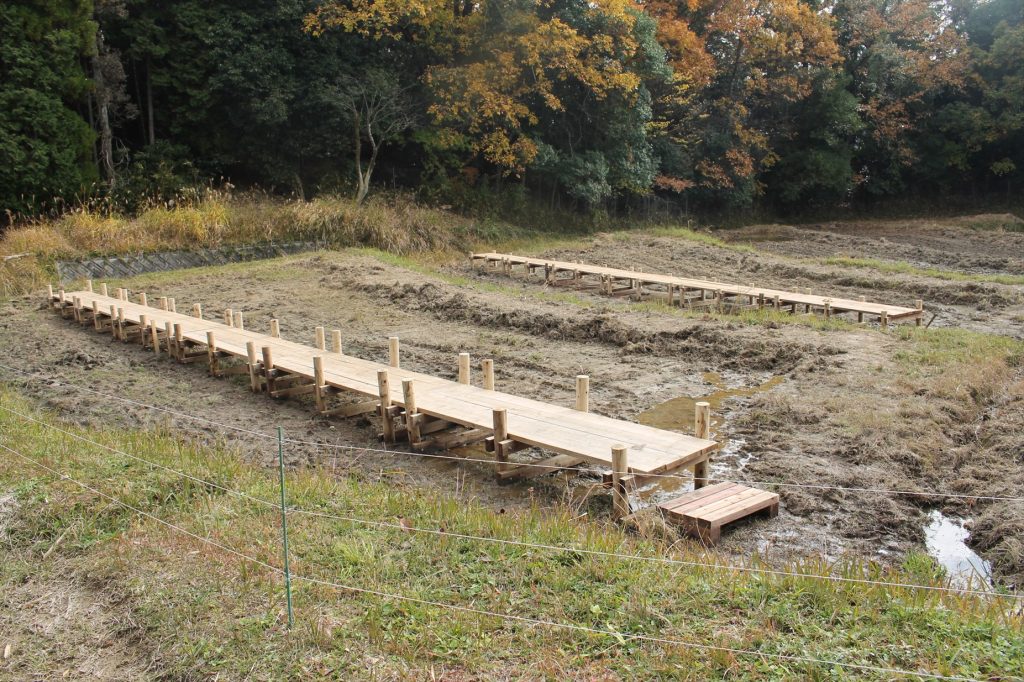 5月のマコモの田植え体験と、6月のマコモ畑に馬糞堆肥を施肥する作業体験は、深水なので、膝下までの長靴を用意してください。また、それ以外の場合でも水たまりがある場所がありますので、雨靴等を着用願います。