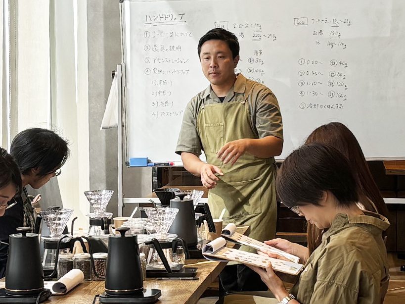 始めに本日使うコーヒー豆の種類、器具についての説明をしていただきます。そこから実際にハンドドリップ。コーヒー豆の量や湯量による味の違いを実際に自分の舌で体験します。温度によっても違うので、コップに入れたコーヒーの上の層と下の層では味が違う!という驚きの声も伺うことができました♪
