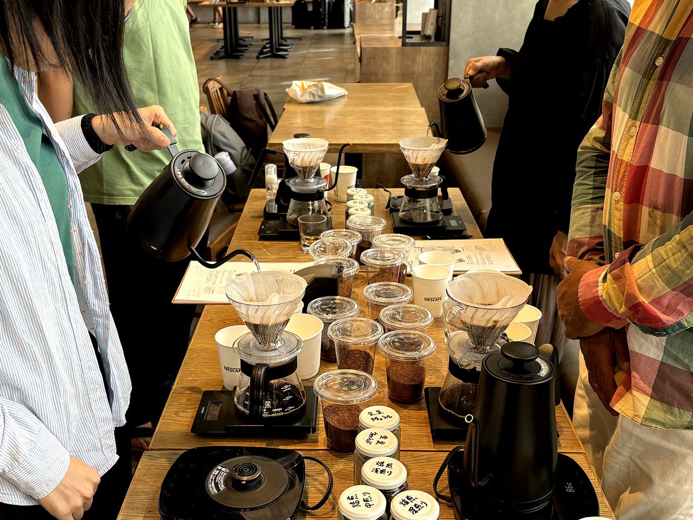 テイスティングでは皆さんが淹れたものをせっかくなので飲み比べ。ほぼ同じ湯量かつ、使っている豆も同じでも淹れ方1つで微妙に味が違います。これには参加者皆さんもびっくりの様子!(もちろん私もびっくりしました笑)