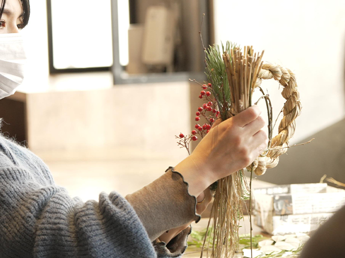 講師はフラワーデザイナーとして活動するle petit bonheur(ル・プティ・ボヌール)の上田さん。従来の形式にこだわらず、和洋折衷織り込んだ自由な雰囲気のしめ飾りづくりがモットーです。